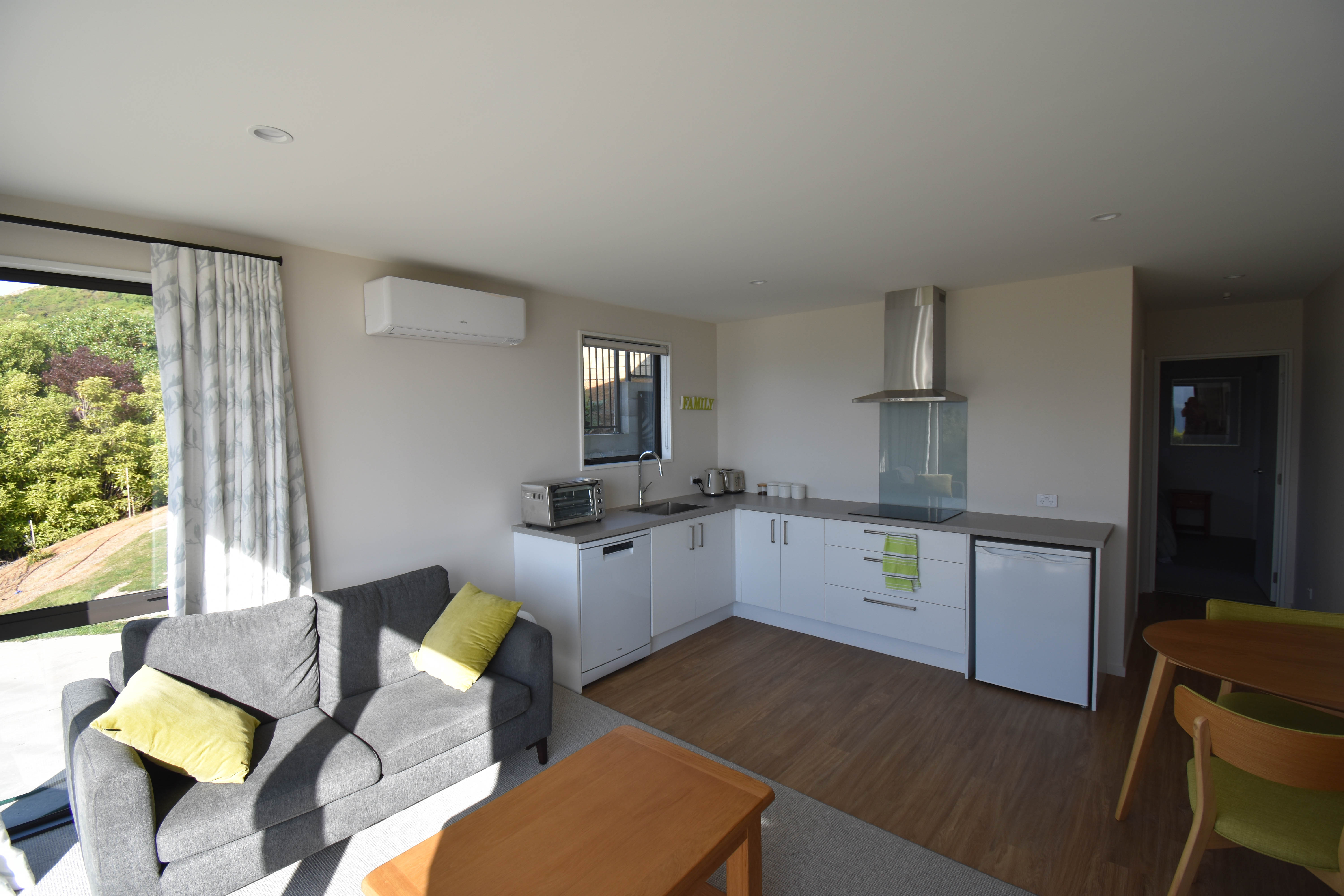 One bedroom, full bathroom, lounge and kitchenette with beautiful view of the harbour. Enough room to park a vehicle and turning area. 30 minutes from Christchurch airport. Ideal for married couples.